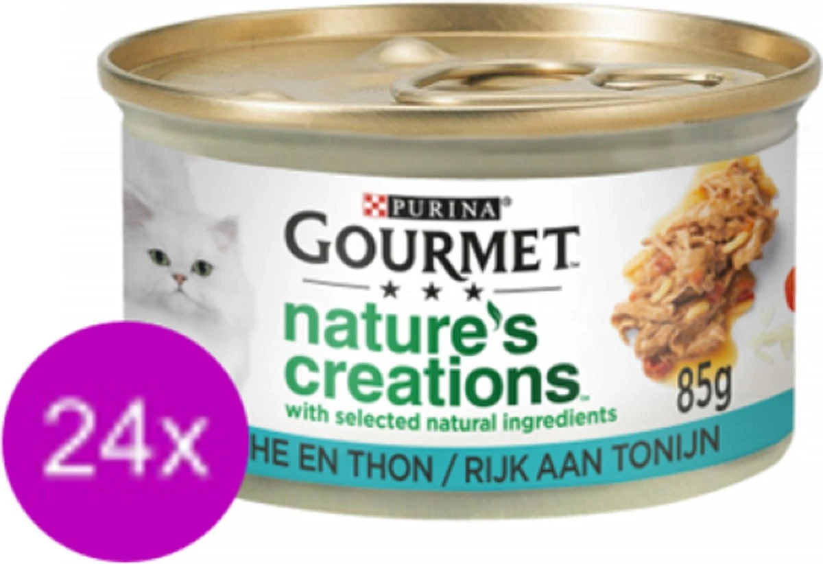 GOURMET™ Nature’s Creations™ is een collectie van heerlijke recepten geïnspireerd door de natuur. Deze recepten komen samen door een reeks geselecteerde natuurlijke ingrediënten te combineren om zelfs de meest kieskeurige katten te plezieren. Als jouw kat een verworven smaak voor vis heeft, zal hij zeker genieten van dit recept: PURINA GOURMET™ Nature’s Creations™ langzaam gegaarde Mini Filets, rijk aan tonijn, gegarneerd met tomaten en rijst. Een voortreffelijke hoofdmaaltijd die hem vanaf de eerste hap zal verleiden. Elk gerecht wordt rechtstreeks van blik naar kom gegoten en wordt geleverd in een eigen blik van 85g, met behoud van smaak en textuur, zodat elke maaltijd net zo lekker is als de vorige. Een voortreffelijk feest voor jouw fijnproever…