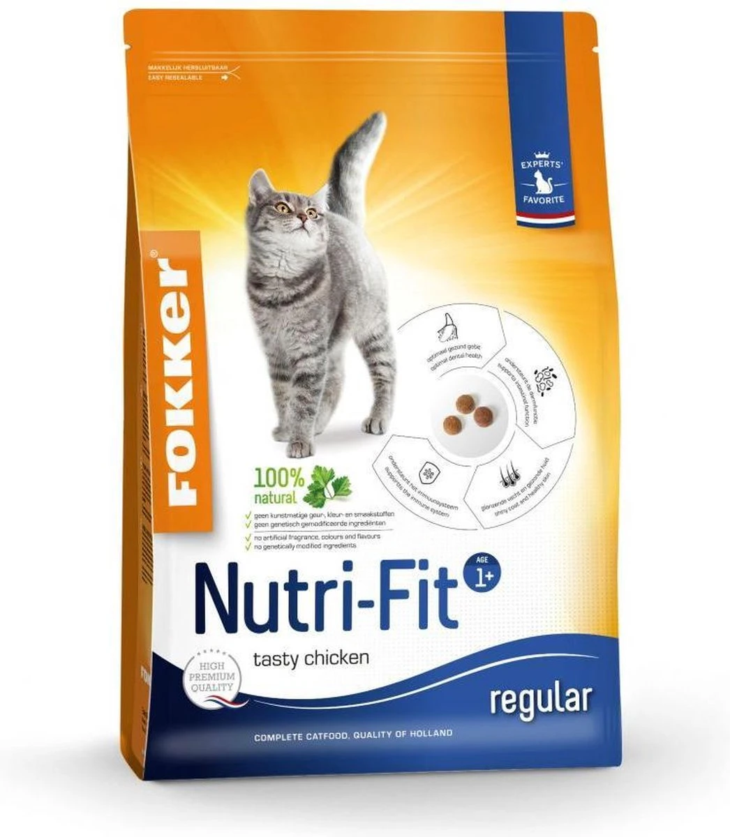 Fokker Nutri-Fit is een volledige premium kattenvoeding voor volwassen katten. De hoogwaardige ingrediënten zorgen voor een optimale conditie van huid en vacht. Fokker Nutri-Fit ondersteunt het goed functioneren van de urinewegen (PH 6 – PH 6,5) en een gezonde darmfunctie. Fokker Nutri-Fit is erg smakelijk en wordt daarom door alle katten graag gegeten.
