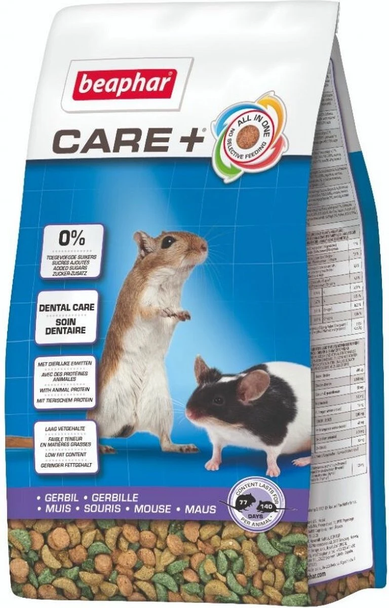 Care+ Gerbil is een zeer smaakvolle super premium voeding. Het is ontwikkeld in samenwerking met dierenartsen en voedingsdeskundigen. Care+ is een geëxtrudeerd, deze hittebehandeling maakt een betere vertering van eiwitten uit het voer mogelijk. De ingrediënten zijn afgestemd op de voedingsbehoefte en benaderen het natuurlijke voedingspatroon. Ieder brokje heeft dezelfde samenstelling (All-in-One), met als resultaat: geen selectief eetgedrag, dus geen restjes en geen tekort aan essentiële voedingsstoffen. De harde brokjes ondersteunen de natuurlijke slijtage van de tanden (Dental Function). De brokjes bevatten verder een uitgebelanceerde verhouding van de meervoudig onverzadigde vetzuren Omega 3 & Omega 6 (uit maïs, tarwe, soja en vlaszaad), met vitamine E voor de lichaamscellen, met dierlijke eiwitten en smakelijke kruiden. Met Care+ heeft u absoluut het beste voor uw gerbil in handen.