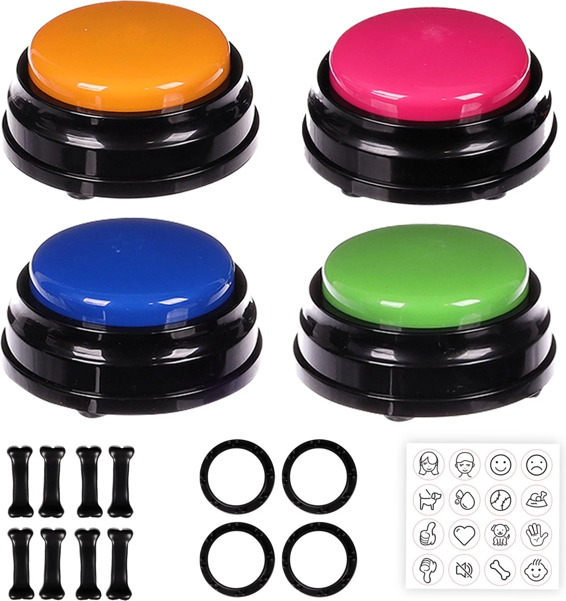 De praatknoppen worden geleverd in een set van 4 praatknoppen. Naast de 4 praatknoppen is de set ook voorzien van trainingpads en trainingstickers. Je kunt de praatknoppen in de pads zetten. Je hond onthoud vervolgens welke praatknop in welke pad staat en weet ook welk woord er aan deze praatknop gekoppeld zit, bijvoorbeeld het woord “eten”. Ook krijg je nog eens 16 training stickers erbij geleverd. Met deze stickers kun je je hond laten begrijpen welke sticker verbonden zit aan welk woord. Staat er bijvoorbeeld een brokje op de sticker dan kun je je hond aanleren dat hier het woord “eten” aan gekoppeld zit. Als je hond wilt eten drukt hij of zij op de praatknop met de sticker van een brokje. Zo maak je het voor je hond extra uitdagend om te leren praten via de knoppen.