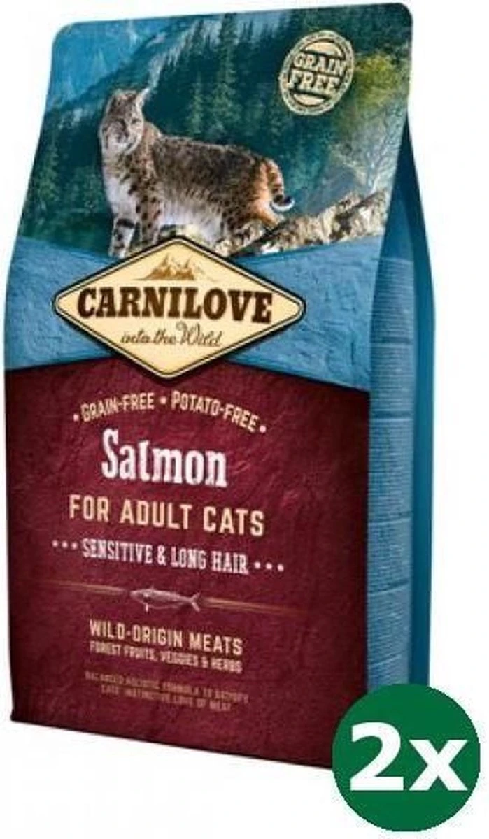 Carnilove Salmon Sensitive / Long Hair 400 grCarnilove Salmon/ Sensitive Long Hair 400 gr is graanvrij, kwalitatief hoogwaardig volledig kattenvoer voor katten met zalm, speciaal voor dieren met lang haar en gevoelige spijsvertering. Deze brokken zijn geheel vrij van aardappel en graan, omdat deze ook niet in het natuurlijke dieet van de wilde kat en diens voorouders voorkomt. In plaats daarvan is er gebruik gemaakt van ingrediënten die beter aansluiten bij de voedingsbehoefte van de kat, namelijk een hoog aandeel dierlijke ingrediënten gecombineerd met verse groenten, fruit, kruiden en mineralen. Deze bevatten belangrijke vitaminen en anti-oxidanten, die door de structuur van de gebruikte eiwitten optimaal opgenomen worden door het lichaam. Ook is dit voer verrijkt om bijzonder geschikt te zijn voor katten met lang haar of een gevoelige spijsvertering. Het voer is nauwkeurig uitgebalanceerd, makkelijker verteerbaar, holistisch en ook gewoon heel erg lekk