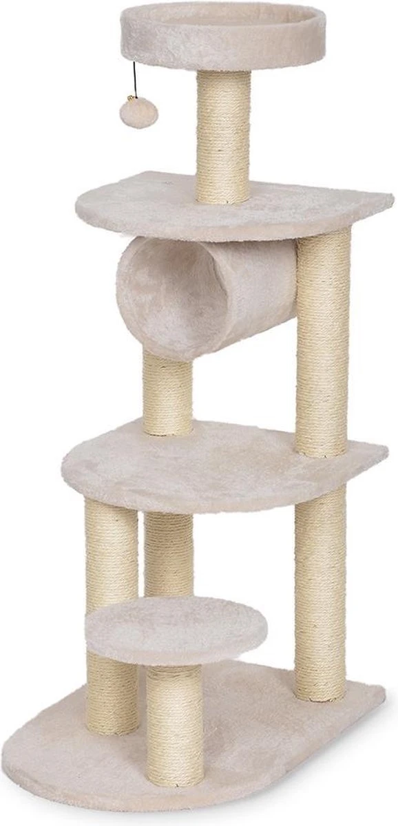 Krabpalen omwikkeld met sisal touw, 4 zachte ligplateaus, een tunnel waar uw kat lekker in kan liggen of spelen en een speelbal die bovenin bungelt.