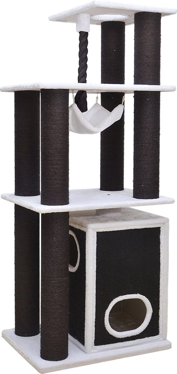 De EBI krabpaal Swindon is een pluche krabpaal van 190 cm hoog dat staat als een huis. Zijn brede opstelling, bestaande uit brede krabstammen van maar liefst 15 cm dik, maakt het geheel super stabiel. De krabpaal heeft alles wat een kattenhart begeert: een stevige ondergrond, brede sisal palen, een comfortabel schuilhuisje bestaande uit 2 verdiepen, een hoge hangmat, een hoge ligmand en een extra dik speeltouw. Deze krabpaal is geschikt voor grote en actieve katten of gezinnen met meerdere katten.
