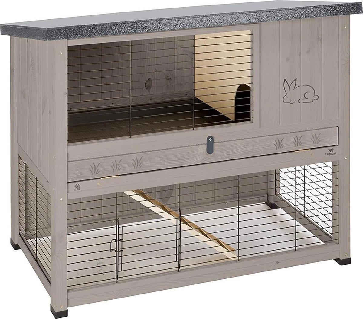 Ferplast heeft een authentiek paleis ontworpen met alle gemakken die uw konijn nodig heeft. Het Ranch 120 Basic konijnenhuis is een echte mini-woning, verdeeld over twee verdiepingen voor de verschillende activiteiten van uw huisdier. De begane grond is het gebied overdag, waar je konijn kan eten, drinken en de wereld buiten kan observeren. Het heeft een metalen hek met schuifdeur en een veiligheidshaak voor het sluiten en een houten trap die naar de bovenverdieping leidt, waar uw huisdier ’s nachts kan slapen of een dutje kan doen gedurende de dag. In dit rustiger gebied is er een comfortabel konijnenhuis, terwijl de bodem twee plastic trays heeft voor het nest.