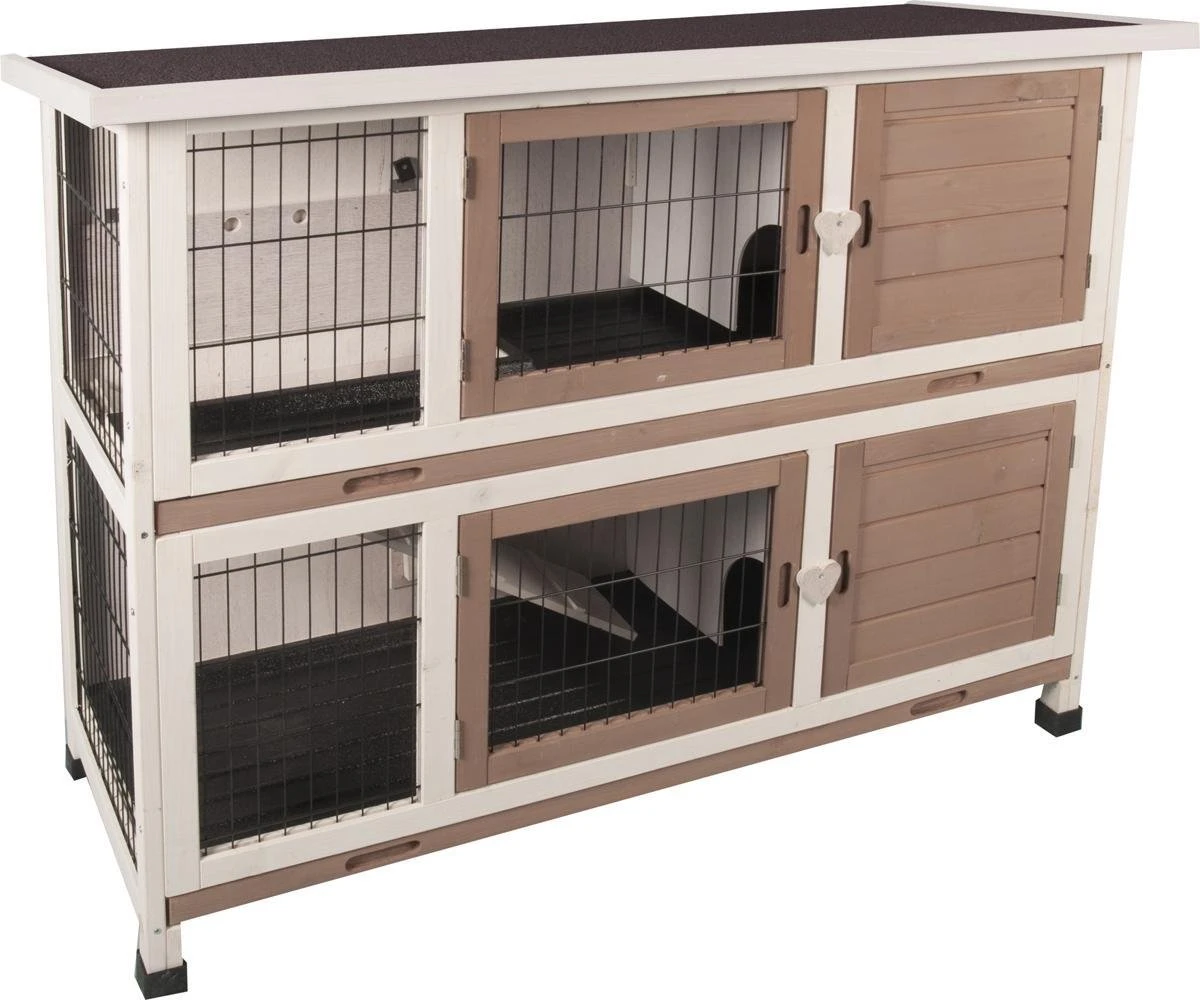 Het konijnenhok Combi 2 Urban is perfect voor de huisvesting van twee konijnen welke nog gekoppeld moeten worden of door andere redenen (tijdelijk) niet samen kunnen zitten. Dit konijnenhok beschikt over twee nachthokken waardoor het hok eenvoudig op te splitsen is in twee verblijven. Beide verblijven zijn voorzien van een schoonmaaklade waardoor het hok eenvoudig schoon te maken is. Door de deurtjes heb je tot beide verblijven voldoende toegang en kun je het konijn op een eenvoudige manier uit het hok halen. Omdat konijnen energieke dieren zijn adviseren wij bij een dergelijk konijnenhok voldoende los loop tijd, dit kun je eenvoudig maken door het konijnenhok te combineren met een konijnenren.
