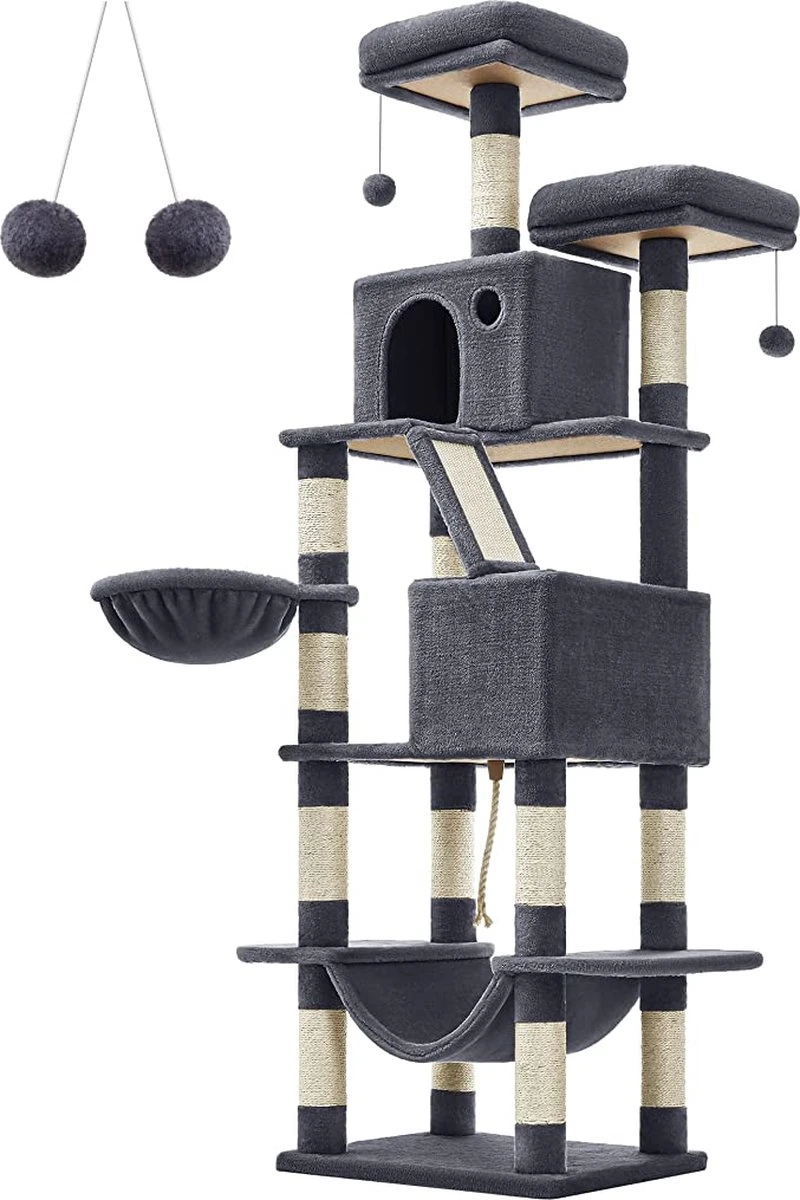 - [All-in-One Playground] Met 2 goed gevoerde zitplatforms, 2 gezellige kattenholen, 1 pluizige mand, 2 pom-poms en 1 hangmat met 1 speeltouw erboven, zullen je kleine harige vrienden hier altijd comfort en plezier op vinden kattenboom met meerdere verdiepingen