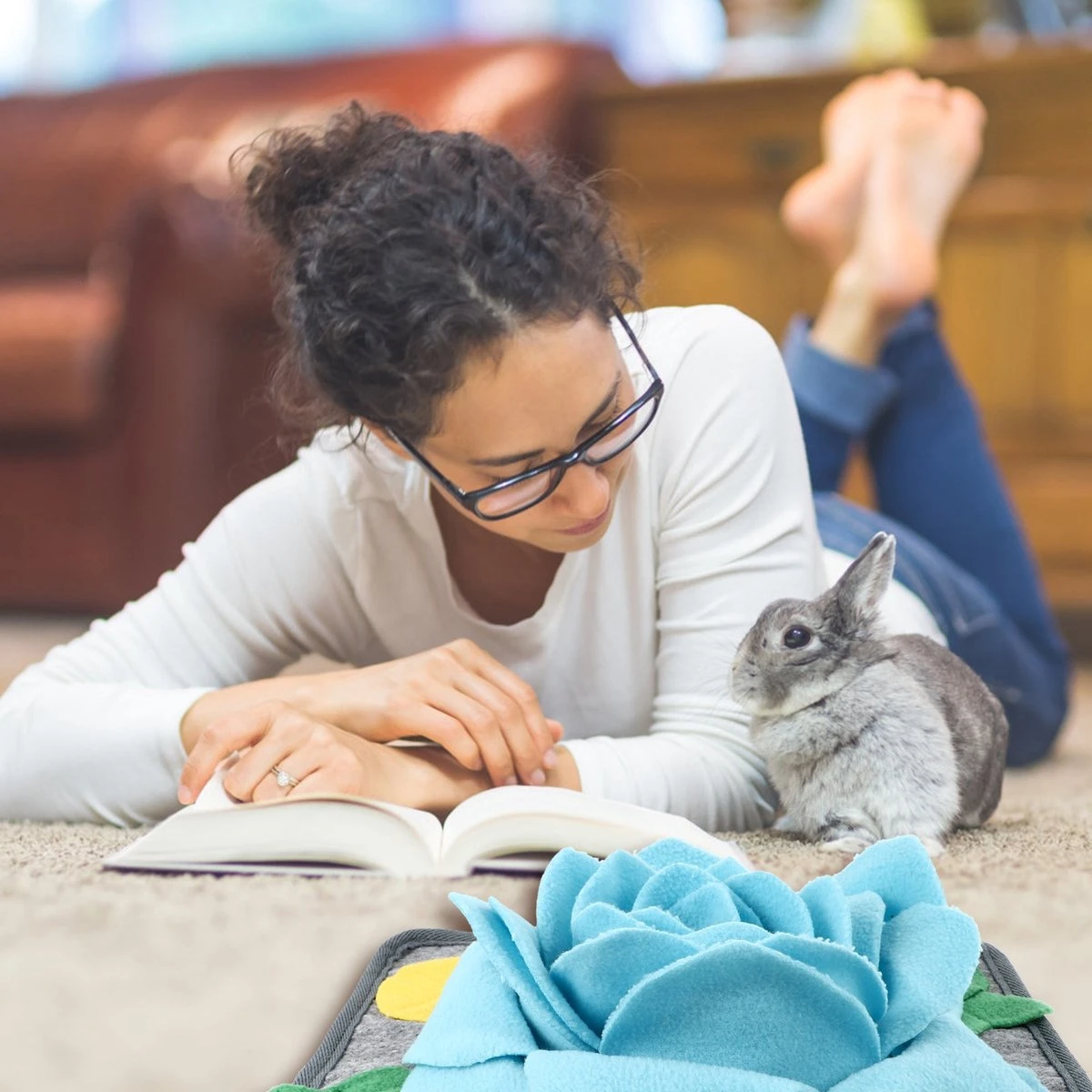 De mat is wasbaar en herbruikbaar, waardoor hij gemakkelijk te onderhouden is en steeds opnieuw gebruikt kan worden. Het ontwerp van de mat is zo gemaakt dat uw konijn wordt uitgedaagd om zijn neus te gebruiken om voedsel te vinden dat in de mat verstopt zit. Dit is niet alleen goed voor de mentale en fysieke gezondheid van uw konijn, maar zorgt er ook voor dat uw konijn meer voldoening haalt uit het eten van voedsel en minder snel verveeld raakt.