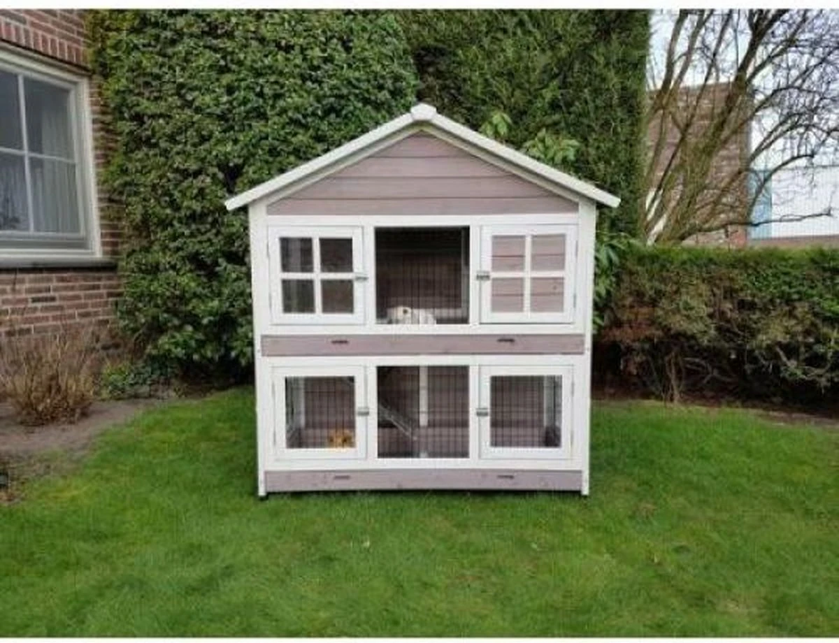 Konijnenhok Double Deluxe β Afmetingen: 125 x 67 x 133cm β Met anti-knaagstrips Konijnenhok Double Deluxe is een plaatje om te zien. De twee verdiepingen zorgen voor een speels effect en genoeg bewegingsvrijheid. Daarnaast is het hok ook nog eens uit te breiden met een of twee rennen. Het konijnenhok beschikt over twee diepe lades voor het makkelijk schoonmaken en maar liefst 4 deuren. Hierdoor kan je ten alle tijden bij je konijn. De zijpanelen van de onderste verdieping zijn tevens uitneembaar voor als je er een extra ren aan wilt koppelen. De bovenverdieping heeft rechts een apart nachthok en het linkerdeurtje is voorzien van plexiglas voor extra beschutting, maar wel voldoende lichtinval. De onder verdieping is op de randen voorzien van knaagstrips. Hoeveel konijnen passen in dit hok? Alle maten Onderdeel hok Afmet