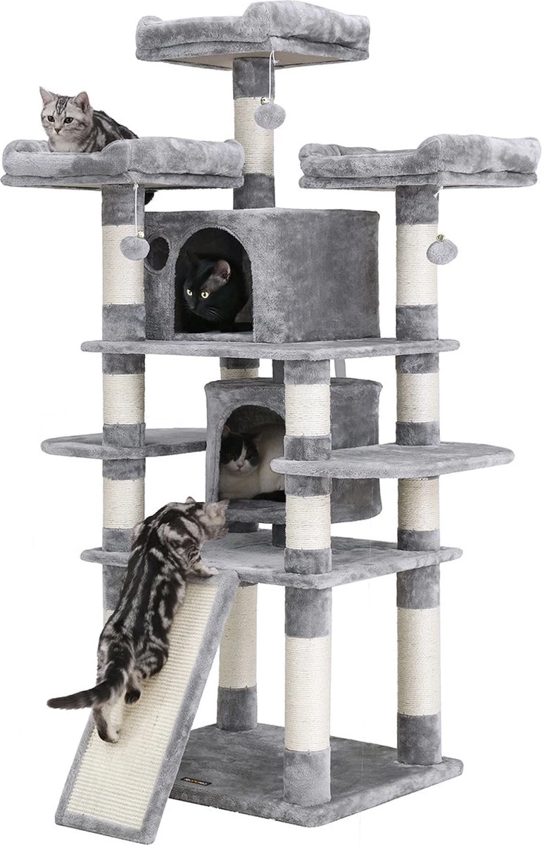 Over dit item Waar moet uw kat beginnen? 2 uitkijkplatforms boven, 1 knuffelige grot met hellingbaan, 1 ligkom, 1 haarbal … Wauw, zoveel te beleven! Waar ze ook begint, ze zal zich nooit vervelen op deze krabpaal vol verrassingen! Voor een energieke kat? Geen probleem! Deze krabpaal heeft een verstevigde fundering en een anti-tip zodat jouw zoete bundel energie er wild op kan rondspringen Rondom gezellig! Kruip in de hangmat, rust uit op de donzige plateaus en laat je hoofd rusten op de verhoogde rand, doe een dutje in de ruime knuffelgrot … je kleine tijgers zullen dol zijn op alle gezellige plekjes! Krassen, krabben, krabben: een nieuwe kras op je bank? Hoe zit het met een alternatief? Dankzij de in sisal gewikkelde stammen is deze krabpaal ideaal voor het slijpen van klauwen. Uw huiskat zal hier stoom afblazen en de meubels zullen u er dankbaar voor zijn Maak uw katten blij: verwen uw katten met deze krabpaal zodat ze zich niet eenzaam voelen als u weg bent, maar lekker kunnen spelen en comfortabel kunnen ontspannen. Productdetails: Kleur: Lichtgrijs Materiaal: spaanplaat, pluche, sisal Maat: 50 x 45 x 142 cm (L x B x H) Gewicht: 14 kg Leveringsomvang: 1 x krabpaal 1 x antikantelbeveiliging 1 x handleiding