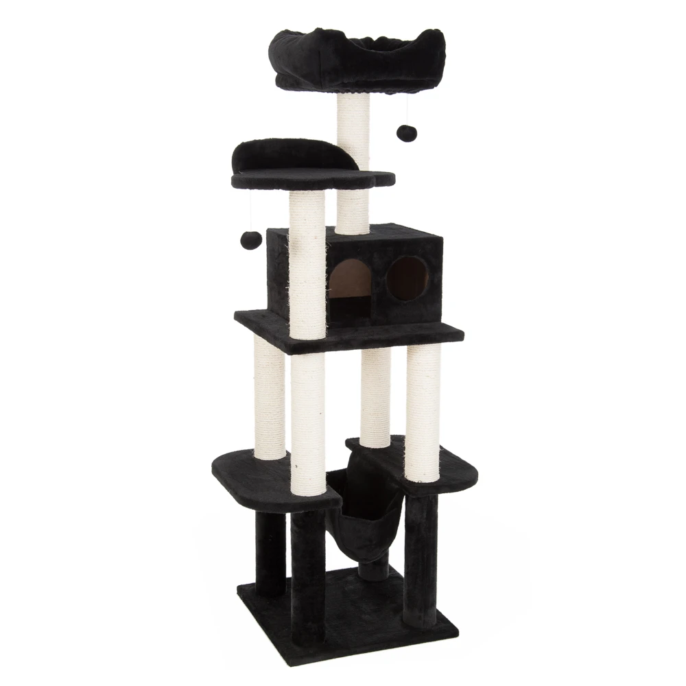 Een paradijs voor klimgrage katten: de uiterst stabiele krabpaal La Digue III biedt jouw kat op verschillende etages een rijke keuze aan krab-, speel- en slaapmogelijkheden. Aan de robuuste sisalstammen kan jouw kat uitgebreid haar nagels scherpen en wild klimmen. De zachte hangmat tussen twee platformen kan naar de zijkant of naar voren worden gericht. In het ruime huisje op de tweede etage kan je kat zich terugtrekken en verstoppen. Nog een comfortabele plek vindt jouw kat op een platvorm in de vorm van een pootje. Het bovenste platform is op luchtige hoogte: klimt je kat op dit bijzonder comfortabele uitkijk dan kan hij van boven zijn omgeving in de gaten houden. Het hoekige knuffelkussen is zacht gestoffeerd en met een dikke rand een bijzonder comfortabele slaapplek. Indien gewenst kun je het bed van het platform verwijderen om het te reinigen. Twee kleine pluche diertjes met echte veren, een muis en een vogel, hangen aan een rubber touw van de beide bovenste platformen en stimuleren het natuurlijke jachtinstinct en de speeldrang van je kat. Krabpaal La Digue III in één oogopslag: Ideaal voor huishoudens met meerdere katten en voor jonge, stormachtige katten Stevige constructie: met veel robuuste sisalstammen op een bijzonder dikke bodemplaat Vier verschillende niveaus: voor afwisseling Met twee pluche dieren: bengelen aan een touw en animeren om te spelen Kleur: beige, zwart, donkerblauw of lichtgrijs Totale afmetingen: Max. ruimte (hangmat naar voren gericht): H 163 x L 69 x B 68 cm Max. ruimte (hangmat zijdelings gericht): H 163 x L 65 x B 69 cm 1 bodemplaat: L 49 x B 49 cm Extra dik en zwaar 1 hangmat, gemonteerd tussen twee ligplaten: Totale afmetingen: L 69 x B 49 cm Ligvlak: ca. L 35 x B 20 cm 2 platforms, half ovaal: L 49 x B 24,5 cm 1 platform onder het slaaphuis: L 49 x B 49 cm 1 slaap- en speelhuis: Totale afmetingen: L 39 x B 34 x H 23 cm Ingang: B 12,5 x H 17 cm Raam: à 13 cm 1 platform met poten design Totale afmetingen: L 40 x B 37 x H 10 cm Ligvlak: L 39 x B 35 cm Met stabiele rand 1 uitkijkplatform met verwijderbare knuffelbed: Totale afmetingen: L 46 x B 46 x H 11 cm Ligvlak: ca. L 26 x B 26 cm Knuffelbed met dikke rand Wasbaar in een wasmachine tot 30°C 4 pluchestammen: L 40 x à 9 cm 6 sisalstammen: L 40 x à 9 cm Let op: alleen voor gebruik binnenshuis.