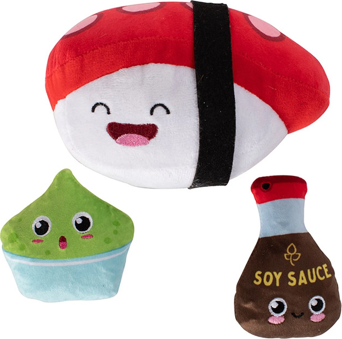 Groot speeltje: Afm. 11,5 x 18 x 10 cm. Kleine speeltjes: Afm. 9,5 x 7,5 cm. Extra luide pieper + Knisperpapier in elk speeltje. Verpakt per set.