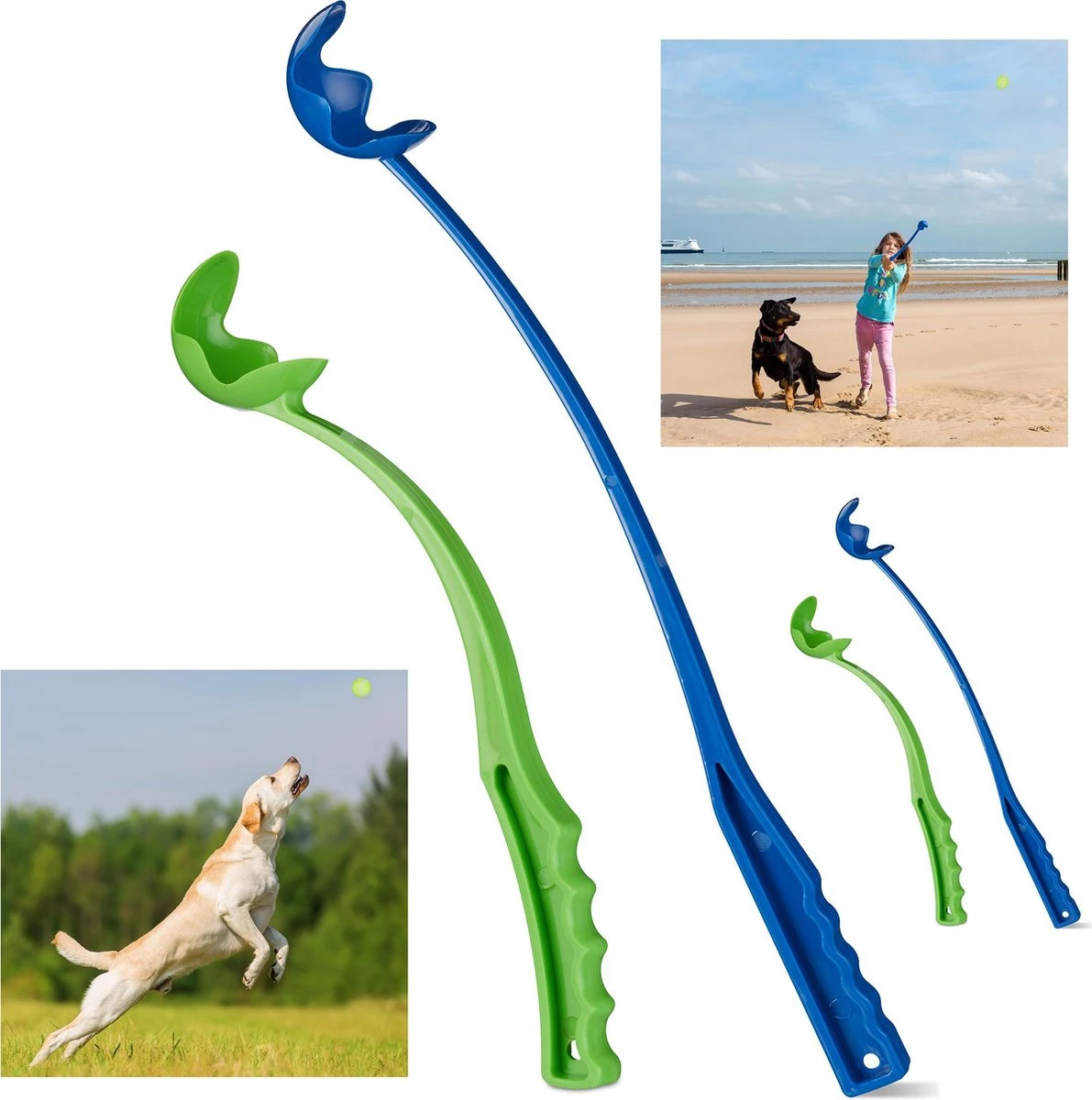 Welke hondenbezitter kent het niet: Het gooien van ballen kan na een tijdje heel vermoeiend worden. De arm wordt moe en de ballen vliegen niet meer zo ver weg. Met de 4 praktische ballenwerpers gooi je de tennisballen met weinig inspanning aanzienlijk verder. Bovendien hoef je je niet meer te bukken om de bal op te pakken en de ballen met de hand aan te raken, maar je kunt ze gewoon met de werpstok oppakken. De balwerper is een pretje voor hond en baasje!