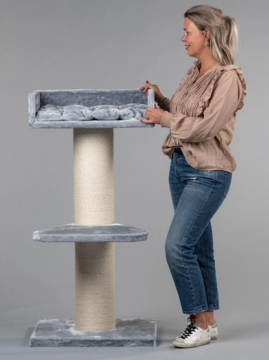 Krabpaal voor grote katten Maine Coon Lounge licht grijs is zeer stabiel met zijn 20cm diameter dikke sisalpalen en verzwaarde bodemplaat van 60×60 en 4,5cm dik. Met enorme ligplek met uitneembaar kussen.