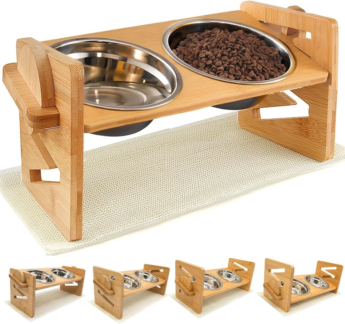 - Uniek M-vormig design en 4 in hoogte verstelbaar: met het W-vormige ontwerp kan het verhoogde bamboe voederstation gemakkelijk van 5,5 cm tot 13 cm worden ingesteld, geschikt voor huisdieren in verschillende stadions, van kindertijd tot volwassen leeftijd. Een verstelbare voederbakstandaard kan bij je honden en katten meegroeien