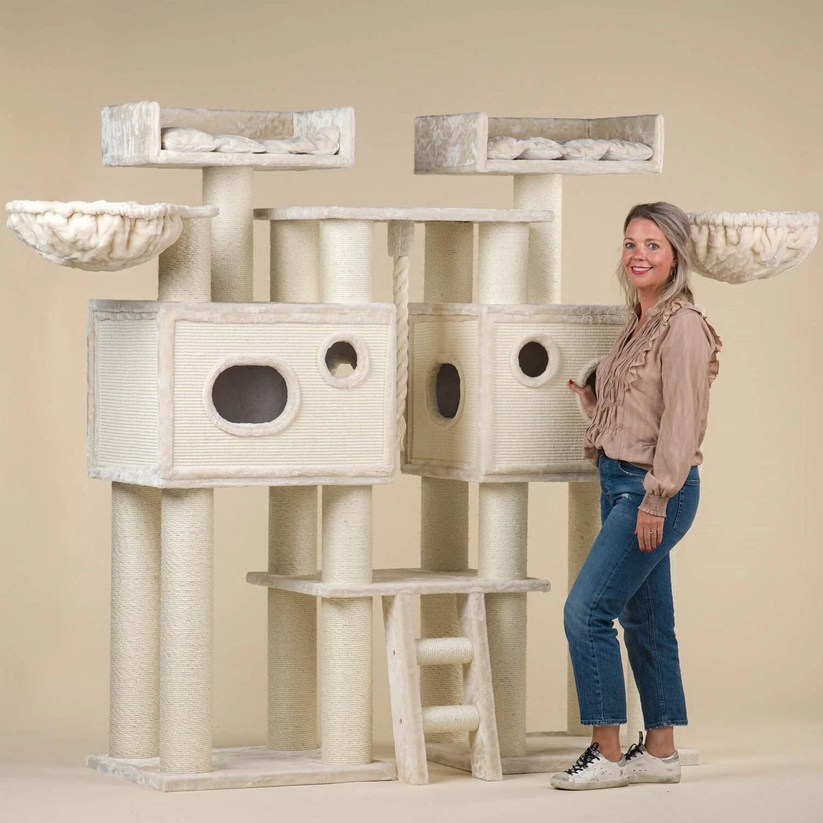 De XXL Krabpaal Royal Cat Palace is de àller grootste krabpaal van RHRQuality en geeft uw katten een plek om te relaxen, avonturieren en ontspannen! Met 15cm dikke sisalpalen, twee enorme kattenlounges, twee sterke en robuuste krabtonnen en twee heerlijke luxe hangmatten is deze geschikt voor de grootste kattenrassen zoals de Maine Coon, Noorse Boskat en Pers. Deze super stabiele en hoogkwalitatieve krabpaal kan zonder enig probleem tot wel 12 ( ! ) katten tegelijkertijd aan.